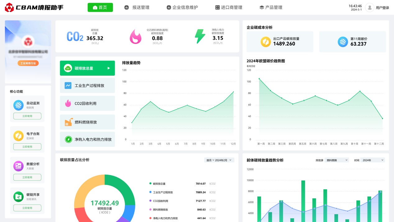 2023年10月1日起,歐盟碳邊境調(diào)整機(jī)制(CBAM)已進(jìn)入過(guò)渡期,CBAM涵蓋范圍的出口產(chǎn)品需按時(shí)提交產(chǎn)品碳排放報(bào)告,未提交報(bào)告的企業(yè)將面臨高額處罰。為解決企業(yè)由于官方政策文件理解難度大,專(zhuān)業(yè)門(mén)檻高,數(shù)據(jù)搜集難度大,部分?jǐn)?shù)據(jù)缺失無(wú)法填等困擾,推出碳關(guān)稅管理平臺(tái)(CBAM填報(bào)助手),通過(guò)數(shù)字化方式,為企業(yè)提供碳數(shù)據(jù)填報(bào)、碳數(shù)據(jù)核算、碳數(shù)據(jù)報(bào)送、碳數(shù)據(jù)認(rèn)證、咨詢(xún)培訓(xùn)等全流程服務(wù)??蓸O大減少企業(yè)碳排放報(bào)送門(mén)檻,助力企業(yè)低成本合規(guī)報(bào)送碳排放數(shù)據(jù)。